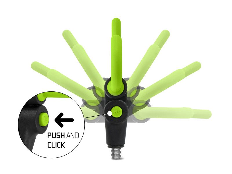 Držiak na feeder tvaru L je výborným pomocníkom každého feedristu. Tvar držiaku umožní udržať prút v rázsoškách aj pri silnom zábere. Vďaka dômyselnému systému tlačidla v spodnej časti, je možné tento držiak polohovať a následne polohu zaistiť. Šírka ramien je 17cm. Držiak je osadený univerzálnym závitom a je kompatibilný s väčšinou rázsošiek a stojanov dostupných na trhu. Farebná zeleno-čierna kombinácia dokonale dopĺňa feedrovú radu REAXE.