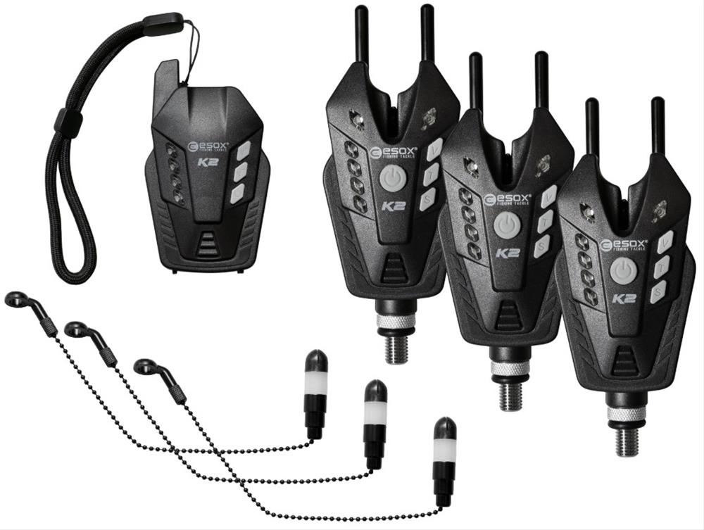 Sada signalizátorov Esox K2 s odnímateľným Snag Gearom a retiazkovými swingrami.