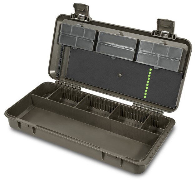 KlikBox Long je navyše vybavený platom z tvrdenej peny a špendlíkmi na pohodlné uchytenie koncových montáží. Pozdĺž celého odkladacieho priestoru na nadväzce nájdete mierku, podľa ktorej si budete vedieť presne určiť dĺžku vašich koncových montáží. Organizér je vyrobený z veľmi odolného plastu a k jeho komfortnému otváraniu a uzatváraniu poslúžia dva pevné plastové klipy.