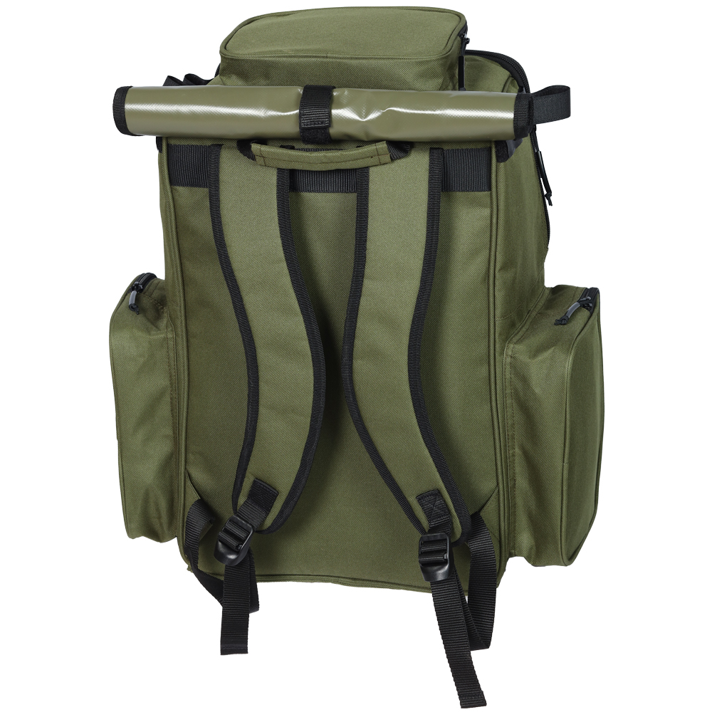 Řada klasických rybářských batohů, které jsou určeny pro širokou rybářskou veřejnost a snadno v nich přepravíte dva teleskopické pruty s navijáky, skládací podběrák a další potřebné vybavení k lovu. Batoh je vyroben z nylonu 300D, v elegantním dvoubarevném zeleno-černém designu. Tento zesílený materiál, který je z vnitřní části pogumovaný zabrání promoknutí batohu a je snadno omyvatelný. Batoh je osazen přední výklopnou větší kapsou a menší vrchní kapsa je určena k uchování dokladů, klíčů a pod, poslední dvě boční jsou hlavně určeny k fixaci prutů či podběráku, ale vejdou se tam různé rybářské doplňky. Batoh má polstrované popruhy, které mají šířku 7 cm a jsou délkově nastavitelné. Spodní ochranná část z vyztuženého PVC, která ochrání batoh před znečištěním a lze jí snadno srolovat.
