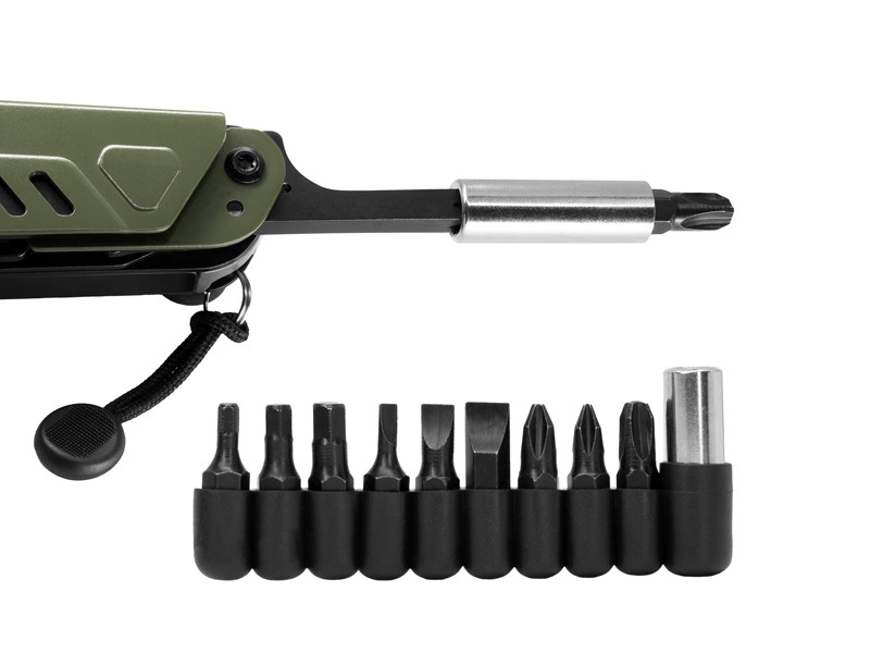 Súčasťou balenia je aj praktický držiak s deviatimi vymeniteľnými bitmi a jedným nadstavcom, ktorý jednoducho nasadíte na skrutkovač nachádzajúci sa na hlavnej konštrukcii. Vďaka tomu vám vznikne “kompaktná dielňa“ schopná poradiť si s rôznymi typmi skrutiek. Či už potrebujete rezať, strihať, otvárať alebo skrutkovať, tento nástroj vám poskytne potrebnú podporu a spoľahlivosť.