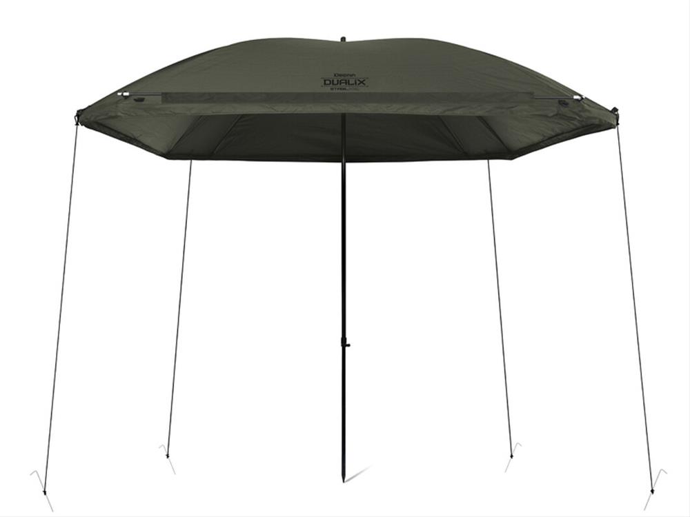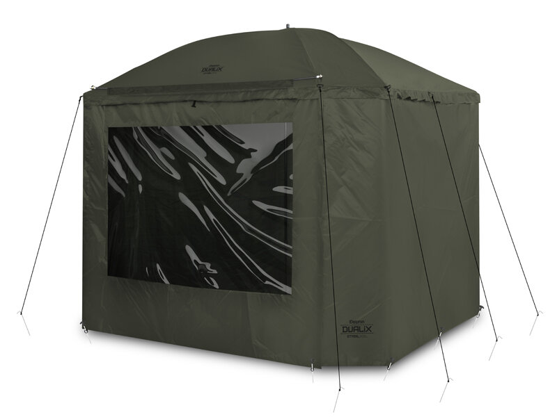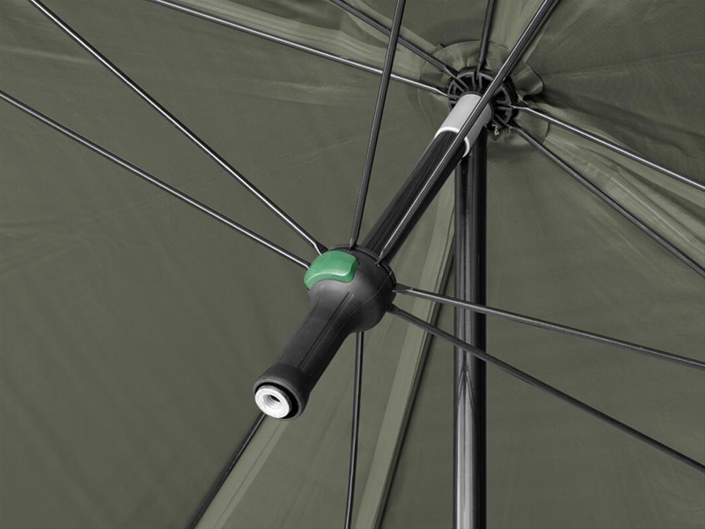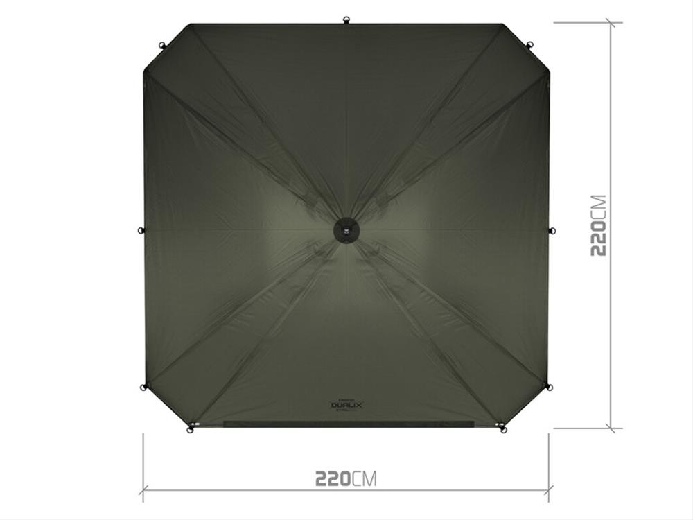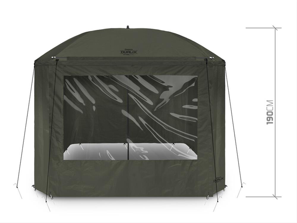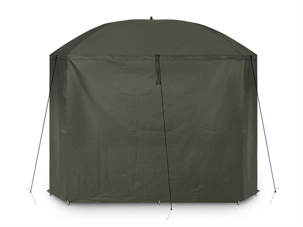 Dáždnik disponuje rozmerom cez kupolu až 320 cm, čím umožňuje doň bez problémov zmestiť dve lehátka a mnoho ďalšieho príslušenstva. Vybavený je celouzatvárateľnou bočnicou, ktorá ponúka ochranu pred nepriazňou počasia a komfort ako v bivaku. Predné dvere bočnice sú doplnené veľkým priehľadným oknom, vďaka ktorému budete mať vždy dokonalý výhľad na vaše prúty a okolie.