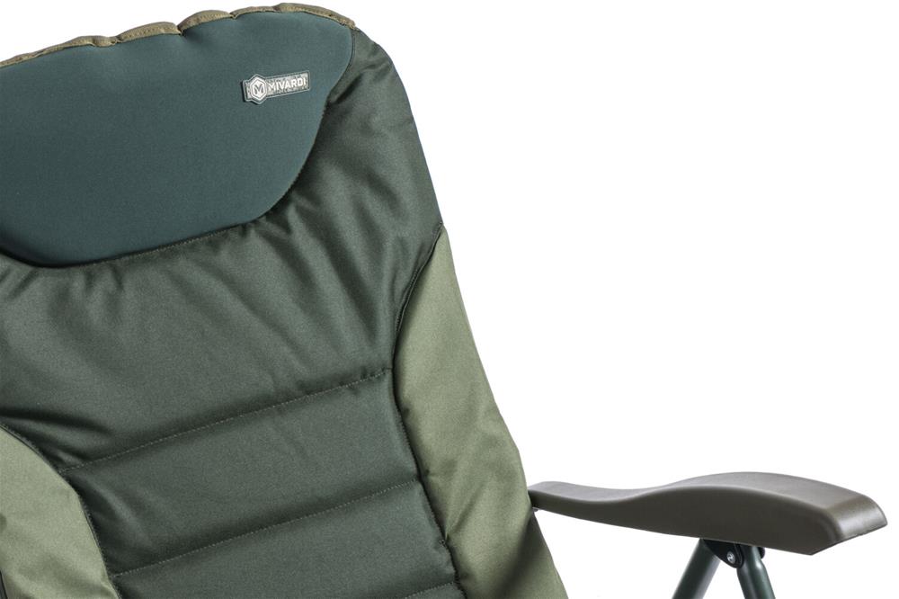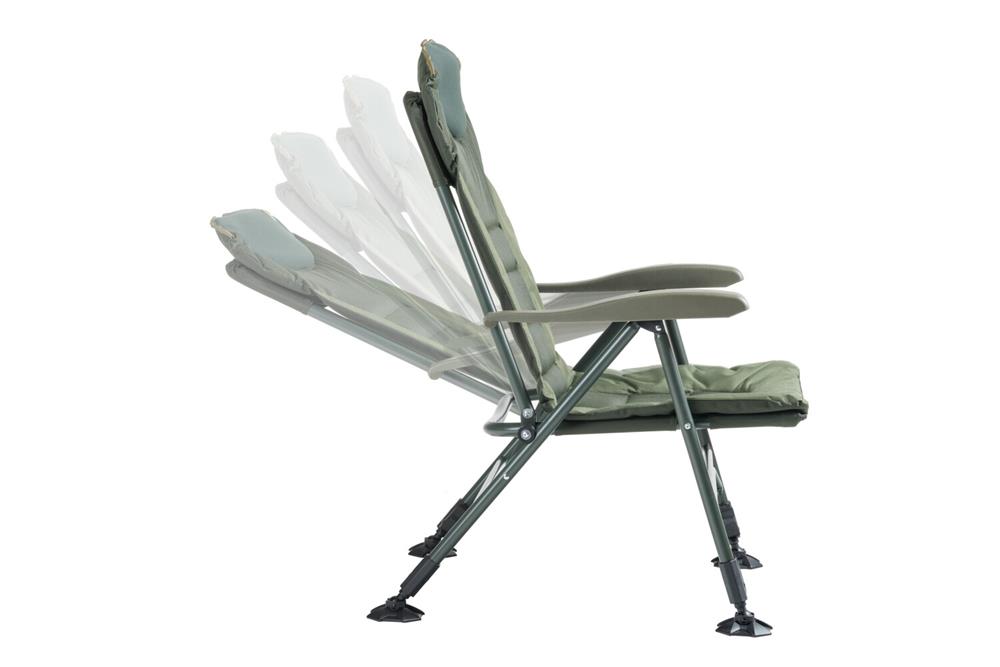 Skvěle navržené křeslo, které plní přání mnoha rybářů. Je vybaveno anatomicky tvarovaným opěradlem a silně polstrovaným neoprenovým polštářem. Všechny čtyři nohy jsou teleskopické, vybavené spolehlivou aretací a velkými patkami proti zaboření. Konstrukce je stabilní, překvapivě lehká a velmi pevná (nosnost 160 kg). Křeslo nabízí pohodlný systém naklápění opěradla při nadzdvižení opěrek na ruce.