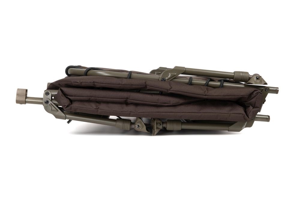 Praktický systém popruhov a praciek umožňuje lehátko kompaktne zložiť, a to aj so spacím vakom pripevneným k lehátku.