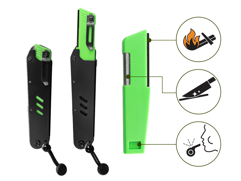 V tele noža je okrem množstva nástrojov tiež zabudovaná odnímateľná časť, ktorá disponuje pilníkom, kresadlom a píšťalkou. Pomocou ostria noža a kresadla si tak viete vytvoriť oheň v prírode bez nutnosti použitia zapaľovača. Pilník dokonale poslúži pri brúsení noža či háčikov a píšťalku možno použiť v prípade nebezpečenstva alebo pri plašení zveri.