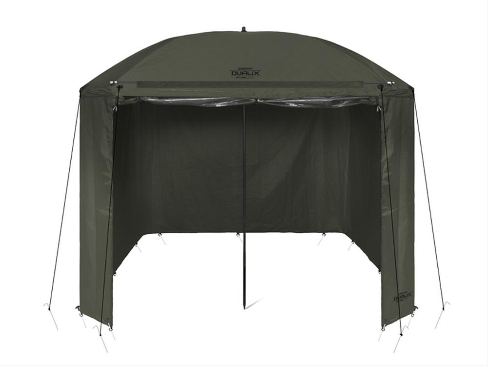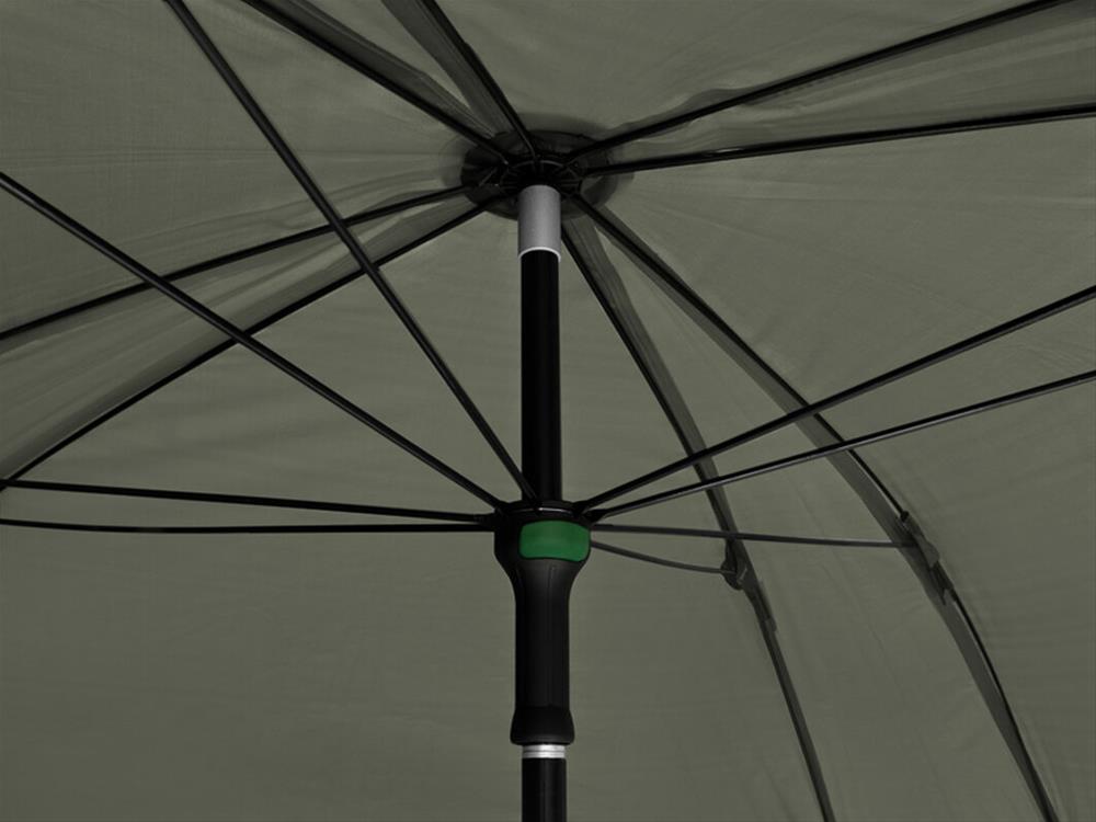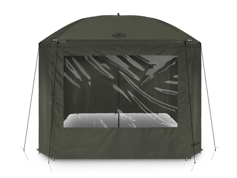Dáždnik disponuje rozmerom cez kupolu až 320 cm, čím umožňuje doň bez problémov zmestiť dve lehátka a mnoho ďalšieho príslušenstva. Vybavený je celouzatvárateľnou bočnicou, ktorá ponúka ochranu pred nepriazňou počasia a komfort ako v bivaku. Predné dvere bočnice sú doplnené veľkým priehľadným oknom, vďaka ktorému budete mať vždy dokonalý výhľad na vaše prúty a okolie.